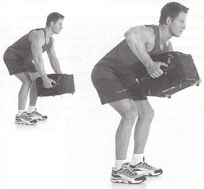 วางเท้าให้ห่างกันพอประมาณ งอหัวเข่าเล็กน้อย รักษาหลังให้ตรง เริ่มบริหาร ใช้แรงจากกล้ามหลัง และกล้ามไบเซบดึงกระเป๋าขึ้นมาแตะที่หน้าอก พยายามให้ตัวกระเป๋าอยู่ใกล้กับลำตัวของเราด้วย ค้างไว้ประมาณ 2 วินาที จากนั้นค่อยๆผ่อนกระเป๋าลงอย่างช้าๆ กลับไปอยู่ท่าเตรียม |