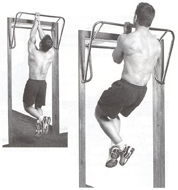 เอาขาไขว้กัน เริ่มบริหาร ดึงตัวขึ้น จนคางเลยบาร์ แล้วค้างที่จังหวะนี้ประมาณ 2 วินาที แล้วผ่อนตัวลงมาสู่ท่าเตรียม อีกครั้งหนึ่ง |