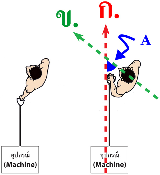 การเคลื่อนที่ในแนวเฉียงไปทางด้านหลัง จะประกอบด้วย 1.การเคลื่อนที่ในแนวเส้นตรงของการแกว่งแขน (ปรากฏตามที่เห็นในภาพข้างบน ที่เป็นเส้นประสีแดง คือมีทิศทางเคลื่อนที่ของแขนไปทางอักษร ก.) 2.ผู้บริหารยืนหันหน้าไปทางตัวอักษร ข. ซึ่งแนวเส้นการหันหน้านั้น (เส้นประสีเขียว) ได้ทำมุมแหลม (มุม A) กับ เส้นประสีแดง ในข้อ 1 ด้วยส่วนประกอบสองแบบนี้ คือการเคลื่อนที่ตามที่ฝรั่งบอกไว้ว่า "your elbows to move slightly behind your body" ที่ทางฝรั่งพยายามพูดถึง แต่มันอธิบายสั้นไปจนเพื่อนสมาชิกอาจมองไม่เห็นภาพ ผมจึงนำเอามาอธิบายด้วยรูปให้เห็นตามภาพข้างบนครับ ผลที่ได้รับ |