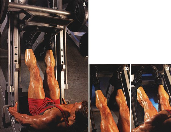 วางเท้าไว้บนที่ถีบ ให้ระยะห่างระหว่างเท้ากว้างเท่ากับหัวไหล่ ช่วงที่ 1 ชี้นิ้วเท้าตรง ( ดังรูปซ้ายสุด ) แล้วบริหาร 30 Reps ช่วงที่ 2 ชี้นิ้วเท้าออกจากกัน ( ดังรูปกลาง ) บริหาร 30 Reps ช่วงที่ 3 ชี้นิ้วเข้าหากัน ( ดังรูปขวา ) บริหาร 30 Reps โดย 3 ช่วงนี้ให้ทำติดต่อกัน โดยคุณมีเวลาพักก็แค่ตอนเปลี่ยนตำแหน่งนิ้วเท้าเท่านั้น ( ประมาณ 2 วินาที ) พอทำครบ 3 ช่วงแล้วจึงถือเป็น 1 เซท ก็ให้วางแป้นเหยียบไว้บนที่วางเหมือนเดิม พักระหว่างเซท 2 นาทีแล้วจึงเริ่มบริหารเซทต่อไป นับทั้งหมด เท่ากับว่าคุณบริหาร 90 Reps ต่อ 1 เซท สำหรับท่านี้คุณไม่ควรใช้น้ำหนักมากๆ คุณต้องเหยียดขาให้ตึง ล็อคหัวเข่าให้อยู่กับที่ และเวลาที่บริหาร ให้ทำแบบ ขึ้นสุดลงสุด ด้วย |