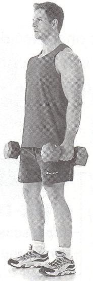 ยืนตรง ถือดัมเบลล์ไว้ในมือทั้งสองข้าง ปล่อยแขนเหยียดตามปกติ