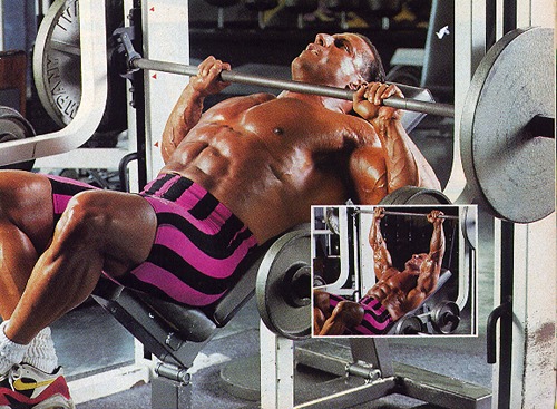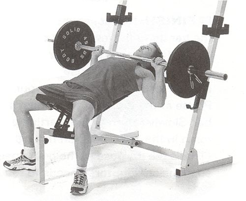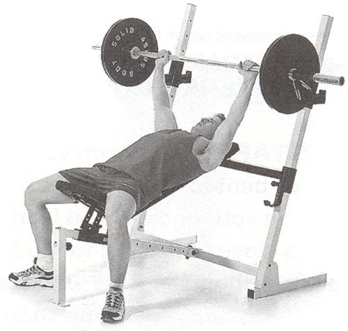 แล้วยกบาร์เบลล์ออกจากที่วาง ชูบาร์เบลล์จนสุดแขน