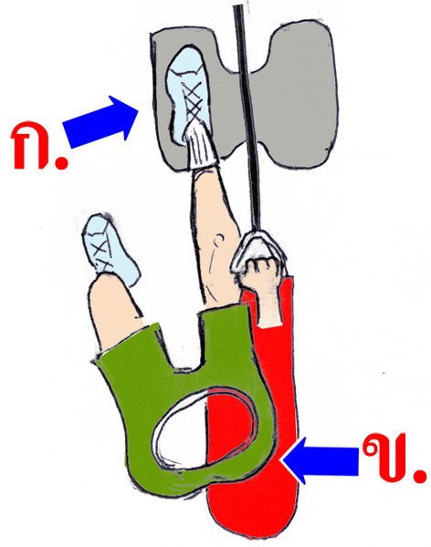 มีตัวหนังสือ ก.ชี้อยู่)ส่วนที่เบาะนั้น ก็ให้เฉพาะต้นขาขวาด้านบน และ "แก้มก้นซีกด้านขวา" เท่านั้น ที่อยู่บนเบาะสีแดง (ในรูปตามที่ มีตัวหนังสือ ข.ชี้อยู่) ส่วนแก้มก้นซ๊กด้านซ้าย และขาด้านซ้ายทั้งหมด ก็ให้อยู่ด้านนอกบริเวณไป ด้วยการจัดท่าทางอย่างนี้ เวลาที่คุณบริหารก็จะพบว่าเส้นทางการเคลื่อนที่ของสายเคเบิลขณะที่ใช้มือขวาดึงเข้าและออกระหว่างที่บริหารนั้น จะอยู่ในแนวตรงเดียวกันตลอดเวลา ทำให้การเคลื่อนที่ของสายเคเบิล ,ของลูกรอก เป็นไปได้อย่างราบรื่นตลอดเวลาที่บริหาร |