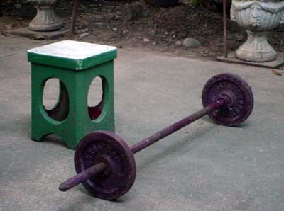 | จุดประสงค์ของท่านี้คือการใช้ "ดัมเบลล์" แต่บังเอิญว่าผมไม่มีภาพการใช้ดัมเบลล์ในการบริหารท่านี้ จึงขออฺธิบายโดยใช้บาร์เบลล์แทน (ตามภาพข้างล่างนี้) แต่จริงๆแล้ว เวลาที่ปฏิบัติ ให้คุณถืมดัมเบลล์ไว้ในมือทั้งสองข้าง ปล่อยแขนเหยียดตามธรรมชาติ แอ่นหน้าอกเล็กน้อย ,ดึงหัวไหล่ไปทางด้านหลัง ,เชิดคาง ,มองตรงไปข้างหน้า ตามภาพข้างบนนี้ครับ |