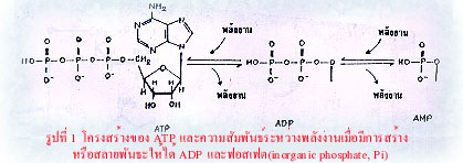 ATP ย่อมาจาก adenosine tri phosphate / เป็นโมเลกุลของน้ำตาล ribose ที่มี adenine และ ฟอสเฟต มาเกาะ / เป็นสารที่ได้มาจาก metabolism หรือการเผาผลาญสารอาหาร เช่น คาร์โบไฮเดรต เป็นโมเลกุลที่เก็บพลังงานไว้ได้มาก ถ้า ATP ถูกสลาย จะปลดปล่อยพลังงานมาให้ร่างกายได้ใช้ประโยชน์ เช่น ใช้ในการหดตัวของกล้ามเนื้อ / ใช้ในการขนส่งสารต่างๆเข้าและออกจากเซลล์ เป็นต้น ข้างล่างนี้ อ้างอิงจาก : http://web.ku.ac.th/schoolnet/snet5/topic8/top811_5.html สารอินทรีย์ที่สามารถสร้างพันธะเพื่อสะสมพลังงานได้มีหลายชนิด แต่สารอินทรีย์ที่สำคัญมากที่สุดที่ใช้ใน การสะสมพลังงานในสิ่งมีชีวิตคือ ATP ( ADENOSINETRIPHOSPHATE ) ชื่อของสารอินทรีย์บอกให้เรา ทราบว่าสารนี้ประกอบด้วยหมู่ฟอสเฟต 3 หมู่ ( TRI = 3 ) การสลายพันธะระหว่างหมู่ฟอสเฟตจะเป็น การปลอดปล่อยพลังงานที่สะสมอยู่ในพันธะออกมา ในทางกลับกันการสร้างพันธะเหล่านี้ก็ต้องอาศัย พลังงานเช่นกัน ( ดูรูปข้างล่างนี้ ) |
