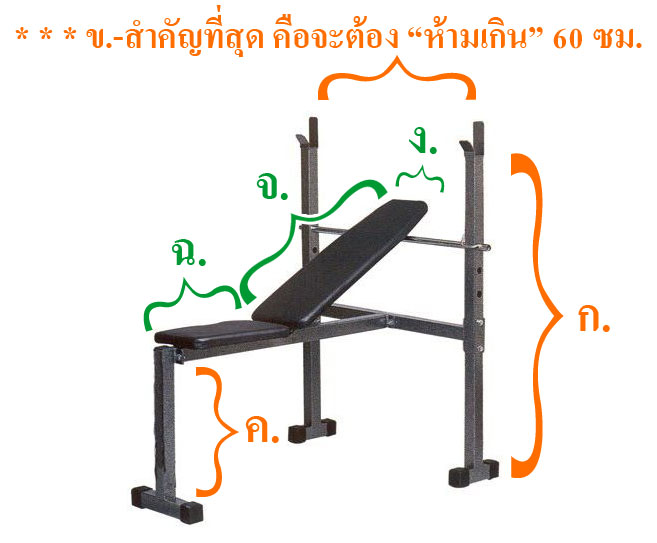 ขนาดของอุปกรณ์ * * * ก. - ความสูงของ Rack หรือช้นวางบาร์เบลล์ คือ 100 ซม. * * * ข. - ระยะห่างของ Rack ทั้ง 2 อัน คือ 60 ซม. / อันนี้สำคัญที่สุดนะครับ คือจะต้องมีระยะห่างตามนี้เลย ( คือ 60 ซม. ) / ที่เน้นอย่างนี้ ก็คือว่า เวลาเราไปหาซื้อที่ไหน ไม่ว่าจะหาซื้อแบบออนไลน์ หรือเดินซื้อตามห้างสรรพสินค้า จะต้องเน้นเรื่องนี้ให้มาก คือ จะต้องมีระยะห่างของ Rack ทั้ง 2 อัน คือ 60 ซม. "เท่านั้น" / ความยาวส่วนอื่นๆ อาจจะอนุโลมได้ แต่เรื่อง ระยะห่างของ Rack ทั้ง 2 อัน จะต้องเป็น 60 ซม. "เท่านั้น" ) * * * ค. - ความสูงของเตียง ( จากพื้น ) คือ 54 ซม. * * * ง. - ความ "กว้าง" ของเบาะ คือ 23 ซม. * * * จ. - ความ "ยาว" ของเบาะส่วนบน ซึ่งก็คือเบาะ ส่วนที่มีไว้สำหรับรองรับ ศีรษะ และหลัง ของผู้บริหาร คือ 71 ซม. * * * ฉ. - ความ "ยาว" ของเบาะส่วนล่าง ซึ่งก็คือเบาะ ส่วนที่มีไว้สำหรับรองรับ ก้น ของผุ้บริหาร คือ 30 ซม. อุปกรณ์นี้ ใช้บริหารท่าอะไรได้บ้าง? * * * กลุ่มของกล้ามหน้าแขน ( ไบเซบ ) - Incline Bench One - Arm Preacher Curl * * * กลุ่มของกล้ามหน้าอก - Flat bench presses - ต้องปรับเบาะส่วนบน ให้ขนานกับพื้นก่อน ถึงจะบริหารท่านี้ได้ - Incline Presses - สามารถปรับองศาของเบาะได้หลายระดับ แล้วบริหารในท่านี้ |