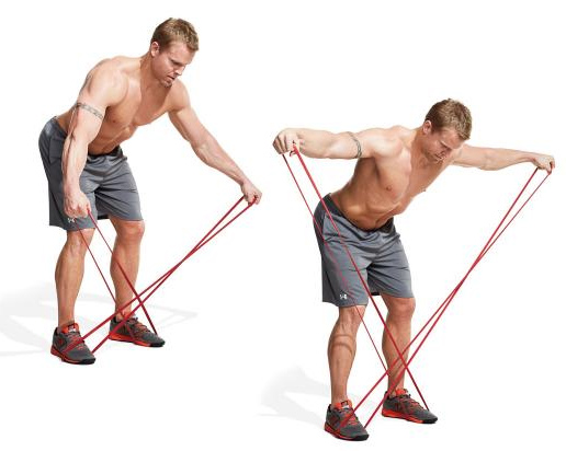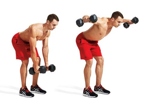 แล้วก้มตัวลงไปข้างหน้า และใช้ดัมเบลล์ในการบริหาร /