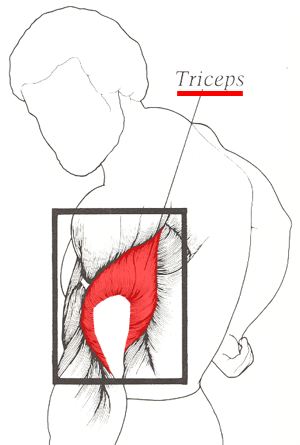 ในภาพซ้ายนี้ แสดงถึงกล้ามเนื้อไทรเซบ ที่กำลังถูกเหยียด ( stretch ) |
