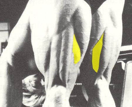 ( ภาพบน ) สีเหลือง คือ กล้ามต้นขาด้านหลังหัวใน ( Inner Head หรือ Semitendinosus ) |