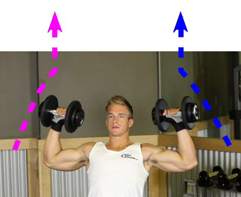 of motion ของแขนแต่ละข้าง ที่ไม่ขึ้นตรงต่อกัน นั่นก็คือ ![]() ![]() และคุณจะเห็นได้ว่า แม้ว่าจะเป็นการใช้ดัมเบลล์ดันขึ้นเหนือหัว เหมือนกับท่าก่อนหน้านี้ที่ใช้บาร์เบลล์ดันขึ้นเหนือหัวก็ตาม "แต่ว่า" ตัว Rang of motion ของการใช้ดัมเบลล์ กลับไม่เหมือนการใช้บาร์เบลล์เลย คือ Rang of motion ของการใช้บาร์เบลล์ดันขึ้นเหนือหัว ก็คือ การเคลื่อนที่ของวัตถุ ( คือบาร์เบลล์ ) ในแนวดิ่งอย่างเดียว ในขณะที่ Rang of motion ของการใช้ดัมเบลล์ดันขึ้นเหนือหัว มันจะมีทั้งการเคลื่อนที่ของวัตถุ ( คือดัมเบลล์ ) ทั้งในแนวดิ่งด้วย ทั้งในแนวไปทางซ้าย และไปทางขวา ของมือแต่ละข้างด้วย ตามที่เพื่อนสมาชิกได้เห็นจากแนวของ เส้นประสีม่วง และแนวของ เส้นประสีน้ำเงิน ในภาพข้างบนนี้ ในต้นฉบับนั้น นักเพาะกายที่ชื่นชอบการใช้ดัมเบลล์ดันขึ้นเหนือหัว เขาจะพูดแบบนี้ว่า "I like using dumbbells is that I can move them through exactly the range of motion that feel right and natural for my own body." / ก็คือการที่นักเพาะกายคนนี้บอกว่า เมื่อใช้ดัมเบลล์ในการบริหารแล้ว เส้นทางการเคลื่อนที่ของวัตถุที่เขาถืออยู่ในมือนั้น ( ซึ่งก็คือดัมเบลล์ ) มันเคลื่อนที่ไปเป็นตามธรรมชาติ ( คือเคลื่อนที่ไปตามแนวของ เส้นประสีม่วง และแนวของ เส้นประสีน้ำเงิน ของแขนแต่ละข้าง ) ซึ่งต่างจากการใช้บาร์เบลล์ ที่มือจะถูกล็อคไว้ที่ตัวคานบาร์เบลล์เลย ทำให้การเคลื่อนที่ของมือทั้งสองข้าง ( เมื่อใช้บาร์เบลล์ ) เป็นไปในรูปแบบของการถูกบังคับ ( คือมือทั้งสองข้าง ถูกบังคับให้เคลื่อนที่ขึ้นและลงในแนวดิ่งเท่านั้น ) ขอยกตัวอย่างอีกอันหนึ่ง ที่ต้นฉบับมักชอบเอาศัพท์ Rang of motion มาใช้ ลองดูภาพข้างล่างนี้นะครับ |