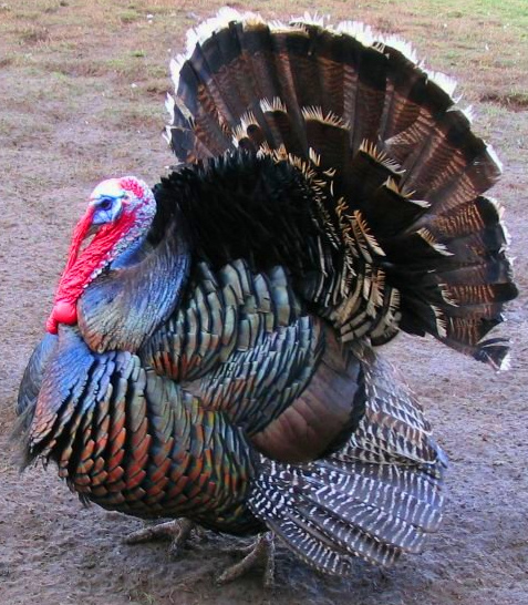 อ้างอิง : https://th.wikipedia.org/wiki/ไก่งวง ไก่งวง ( Turkey ) เป็นนกที่บินไม่ได้ประเภทหนึ่ง จัดอยู่ในวงศ์ไก่ฟ้าและนกกระทา ( Phasianidae ) จัดอยู่ในวงศ์ย่อย Meleagridinae สกุล Meleagris มีปากสั้นเรียวบาง บริเวณหัวบางส่วนและลำคอไม่มีขนที่เห็นชัด แต่มีหนังย่น ๆ และตุ่มคล้ายหูด ขนหางมี 28-30 เส้น แพนหางชี้ตั้งขึ้น ขายาว ลักษณะนิ้วตีนเหมือนกับไก่ในวงศ์ Phasianidae ตัวผู้มีเดือย ขนตามลำตัวเป็นเงา แบ่งออกได้เป็น 2 ชนิด คือ M. gallopavo พบในอเมริกาเหนือ และ M. ocellata พบในอเมริกากลาง ในสหรัฐอเมริกา ชาวคริสต์นิยมรับประทานไก่งวงในวันขอบคุณพระเจ้า ไก่งวง มีขนาดใหญ่กว่าไก่ทั่วไป ในการประกอบอาหาร นิยมยัดไส้นานาชนิด แล้วนำไปปรุงแต่งอาหาร |