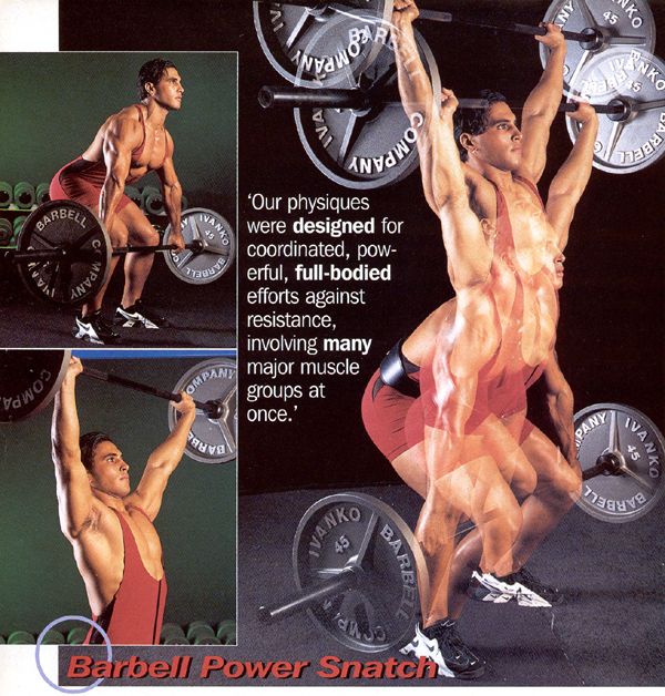 ความหมายของ Weightlifting นั้น แม้ว่าจะไม่ได้เข้าแข่งขันในรายการโอลิมปิค ก็สามารถนำรูปแบบการฝึกมาใช้กับนักกีฬาอื่นๆได้ เช่นนักกีฬาอเมริกันฟุตบอล ก็จะฝึกด้วยรูปแบบการฝึกแบบนี้ (Weightlifting) ดังนั้น นี่จึงตอบคำถามได้ว่าทำไมพวกนักอเมริกันฟุตบอลที่เข้าฝึกในโรงยิมเดียวกันกับนักเพาะกาย ทำไมถึงมีหุ่นไม่สวยเหมือนนักเพาะกาย คำตอบก็คือเขาเข้าโรงยิมเดียวกับนักเพาะกายก็จริง แต่เขาเข้ามาฝึกในรูปแบบของ Weightlifting เพื่อความแข็งแรงของกล้ามเนื้ออย่างเดียว เพราะต้องมีการประทะกันในสนามแข่ง โดยไม่ได้เล่นแบบนักเพาะกายที่ฝึกเพื่อความแข็งแรง และความสมส่วน สวยงามไปพร้อมๆกัน คราวนี้เรามาดูกันว่าท่าฝึกและท่าที่ใช้ในการแข่งขันของกีฬา Weightlifting นั้นมีอะไรกันบ้าง ท่า Snatch |