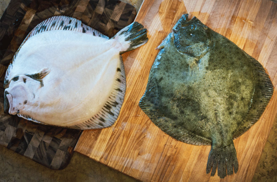 ( ภาพบน ) แฮลิบัต ( Halibut ) - แฮลิบัต มีขนาดใหญ่ที่สุดในบรรดา ชนิดที่มีเนื้อแบน ( Flat Fish ) ทั้งหมด / มีเนื้อแน่นและสามารถแห้งได้หากไม่ปรุงอย่างระมัดระวัง แฮลิบัด พันธุ์ที่มีขนาดเล็กหน่อย คือพันธุ์ chicken halibut ซึ่งผู้บริโภคมักจะซื้อไปปรุงอาหารแบบทั้งตัว / ส่วนพันธุ์ขนาดตัวใหญ่ จะหั่นเป็นชิ้นๆ ( Fillet ) จำหน่าย แฮลิบัต เป็นแหล่ง ไนอาซิน ( Niacin ) ที่ดี / ส่วนไข่ของปลา แฮลิบัด จะให้ วิตามินซี แฮลิบัด มีราคาสูงเพราะรสชาติของเนื้อที่หวาน สีของเนื้อที่ขาวจัดราวกับหิมะ และเนื้อที่แน่นอร่อย นอกจากนี้ยังอุดมด้วยคุณค่าทางโภชนาการ มีโปรตีน และแร่ธาตุสูงแต่แคลลอรี่ต่ำ - - - - - - - - - - - - - - - - - - - ปลาแฮลิบัต ( Halibut ) เป็นชื่อสามัญที่ใช้เรียกปลาในอันดับปลาซีกเดียว ในสกุล Hippoglossus ซึ่งอยู่ในวงศ์ Pleuronectidae รวมถึงปลาซีกเดียวชนิดอื่น ในวงศ์อื่นบางชนิดด้วย โดยคำว่า "แฮลิบัต" มีที่มาจากคำในภาษาอังกฤษกลางว่า haly ( ศักดิ์สิทธิ์ ) และ butt ( ปลาซีกเดียว ) เป็นปลาที่ได้รับความนิยมในวันสำคัญทางศาสนาคริสต์คาทอลิก ปลาแฮลิบัตเป็นปลาซีกเดียวที่มีขนาดใหญ่ นับเป็นปลาซีกเดียวที่มีขนาดใหญ่ที่สุดในโลก มีความยาวเต็มที่ที่พบคือเกือบ 3 เมตร น้ำหนักกว่า 50 กิโลกรัม พบกระจายพันธุ์ในซีกโลกทางเหนือที่มีอุณหภูมิหนาวเย็น ทั้งมหาสมุทรแอตแลนติกและมหาสมุทรแปซิฟิก เนื้อของปลาแฮลิบัตมีสีขาว เนื้อแน่นคล้ายปลาหิมะ ไขมันต่ำ มีราคาแพง สามารถนำไปปรุงอาหารได้หลากหลายรายการ เช่น ฟิชแอนด์ชิป นับเป็นปลาเศรษฐกิจที่สำคัญอีกชนิดหนึ่ง ปลาแฮลิบัตเป็นปลาที่หากินและอาศัยอยู่ตามพื้นทะเล ลักษณะเหมือนกับปลาซีกเดียวทั่วไป คือ ลำตัวด้านบนที่มีตา จะเป็นสีน้ำตาลหรือเขียว ด้านล่างจะราบแบนเป็นสีขาวสะอาด ในระยะที่เป็นปลาวัยอ่อน ตาทั้งสองข้างจะยังอยู่คนละซีกเหมือนปลาทั่วไป และว่ายน้ำเหมือนปลาแซลมอน จนกระทั่งอายุได้หกเดือนจึงจะกลับด้านมาอยู่ซีกเดียวกัน กินอาหารตามพื้นทะเล ได้แก่ สัตว์ทะเลต่าง ๆ รวมถึงปลาแฮลิบัตหรือปลาซีกเดียวตัวอื่นๆ ด้วย และตกเป็นอาหารของสัตว์ทะเลนักล่า เช่น วาฬเพชฌฆาต , สิงโตทะเล , ปลาฉลามแซลมอน การจำแนก สกุล Hippoglossus แบ่งออกได้เป็น 2 ชนิด * * * ปลาแฮลิบัตแอตแลนติก , H. hippoglossus * * * ปลาแฮลิบัตแปซิฟิก , H. stenolepis จำพวกอื่น ที่อยู่ในวงศ์ Pleuronectidae * * * Atheresthes evermanni – ปลาแฮลิบัตฟันลูกศร * * * Eopsetta grigorjewi – ปลาแฮลิบัตสั้น * * * Reinhardtius hippoglossoides – ปลาแฮลิบัตกรีนแลนด์ * * * Verasper variegatus – ปลาแฮลิบัตจุด ที่อยู่ในวงศ์ Paralichthyidae * * * Paralichthys californicus – ปลาแฮลิบัตแคลิฟอร์เนีย * * * Paralichthys olivaceus – ปลาแฮลิบัตบาสตาร์ด ที่อยู่ในวงศ์ Psettodidae * * * Psettodes erumei – ปลาแฮลิบัตควีนส์แลนด์หรือปลาตาเดียว ที