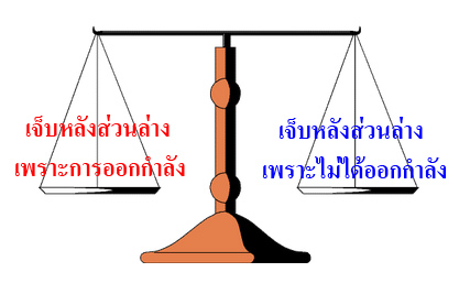 ด้วยการไม่บริหารกล้ามเนื้อส่วนนี้เลย ก็ไม่ถูกต้องอีก เหตุผลก็เพราะว่า คุณจำเป็นจะต้องบริหารกล้ามเนื้อหลังส่วนล่างให้แข็งแรง เพราะกล้ามเนื้อส่วนนี้มีความสำคัญต่อการเคลื่อนที่ ,มีความสำคัญต่อการนั่งเฉยๆ ,มีความสำคัญต่อการก้มและยกสิ่งของ ดังนั้น ถ้ากล้ามเนื้อหลังส่วนล่างไม่แข็งแรงแล้วล่ะก็ มันจะส่งผลไม่ดีต่อสุขภาพโดยรวมของคุณ เช่นว่า คุณอาจจะบาดเจ็บที่หลังส่วนล่างได้ด้วยการทำภารกิจธรรมดาๆในชีวิตประจำวัน เช่น นั่งเฉยๆเป็นเวลานานๆก็ปวดหลังส่วนล่างแล้ว ,หรือพอก้มลงหยิบของผิดท่าหน่อย คุณก็ปวดหลังแล้ว ( นั่นเพราะกล้ามหลังส่วนล่างคุณไม่แข็งแรง ) |