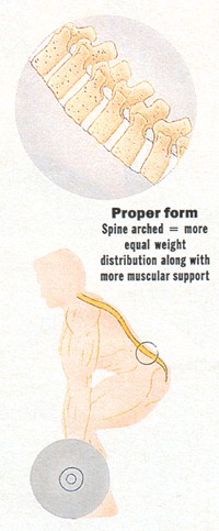 คือห้ามทำท่าเหมือนในรูปข้างบนนี้ตลอดเวลาที่บริหารท่า Crunch สรุปว่า คุณ ไม่สามารถ พูดสรุปได้ว่า ถ้าไม่อยากบาดเจ็บที่หลังส่วนล่างด้วยการยน้ำหนักล่ะก็ คุณจะต้องแอ่นหลังตลอดเวลาที่บริหาร เหตุผลก็เพราะ ในการบริหารบางท่า การแอ่นหลัง ก็ทำให้บาดเจ็บได้เหมือนกัน ที่ถูกแล้ว คุณจะต้องสรุปแบบแยกเป็นสองประเด็น ดังข้างล่างนี้ครับ |