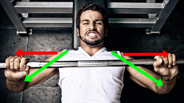 Tucked in elbows ) ส่วนการจับบาร์ โดยแนวของข้อศอก อยู่ในแนวของ ลูกศรสีแดง ในภาพข้างบนนี้ มันคือการวางตำแหน่งข้อศอกแบบ กางข้อศอกออก ( Flared out elbows ) นั่นเองครับ |