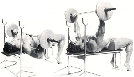 | (ภาพบน) นอนดันหน้าอกบนม้าราบ ด้วย"บาร์เบลล์" |