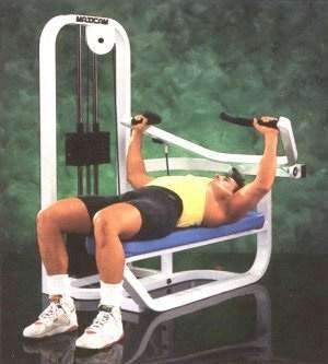 ในกรณีที่หนังสือต้นฉบับ บอกว่าให้ใช้ท่านอนดันหน้าอกบนม้าราบ (Flat bench presses) ก็แสดงว่าผู้พูดไม่ได้เน้นว่าต้องใช้ บาร์เบลล์ หรือ ดัมเบลล์ หรือ เครื่องสมิทแมชชีน หรืออุปกรณ์แมชชีนแบบนอนเล่น ,หรืออุปกรณ์แฮมเมอร์ (ปรากฏในภาพข้างล่าง) ดังนั้น เมื่อบอกว่าให้บริหารโดยใช้ท่านอนดันหน้าอกบนม้าราบ (Flat bench presses) ก็ให้เพื่อนสมาชิกเลือกท่าบริหารดังข้างล่างนี้ ท่าใดท่าหนึ่งไปใช้ได้เลยครับ |