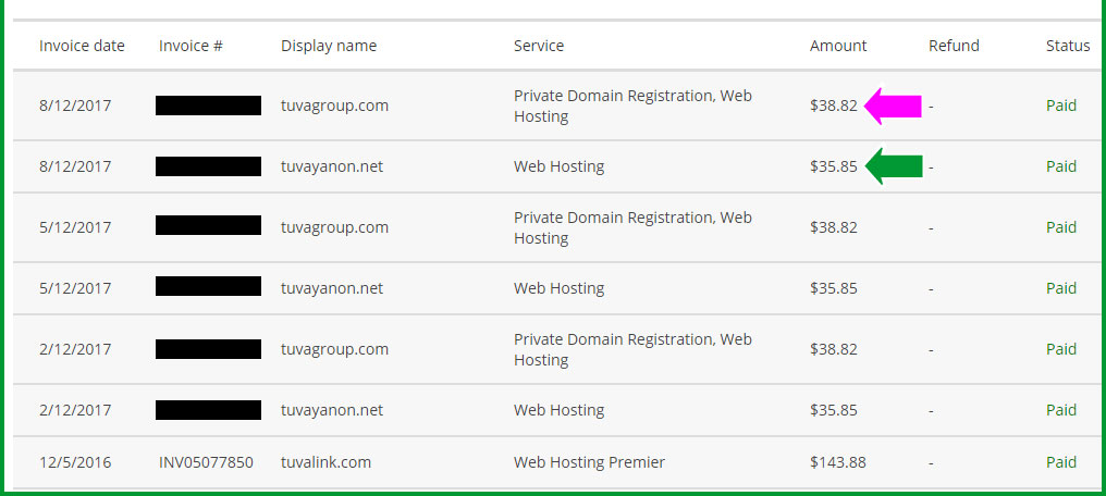 3 เดือนต่อ 1 ครั้ง ) โดยการชำระแต่ละครั้ง จะต้องชำระ 74.67 เหรียญ ซึ่งยอด 74.67 เหรียญ ก็มาจากค่าเช่า Host ชื่อ tuvagroup.com เป็นเงิน 38.82 เหรียญ ( ตรงที่ ลูกศรสีม่วง ชี้อยู่ในภาพข้างบนนี้ ) + ค่าเช่า Host ชื่อ tuvayanon.net เป็นเงิน 35.85 เหรียญ ( ตรงที่ ลูกศรสีเขียว ชี้อยู่ในภาพข้างบนนี้ ) ซึ่งงราคา 74.67 เหรียญนี้ นับว่าถูกกว่าแต่ก่อนแล้ว เพราะว่าผมเลือกใช้แบบถูกลง ( แต่ก่อนใช้แบบ Unlimited - คือใส่ข้อมูลมากเท่าไรก็ได้ ไม่จำกัด ก็เลยทำให้ค่าเช่า Host มันสูง / ตอนหลัง ผมเลยลดค่าบริการลง ( คือใส่ข้อมูลได้น้อยลง ) เพื่อความประหยัดแล้วครับ ) |