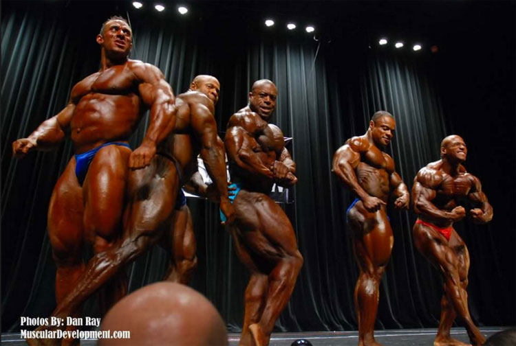 และนั่นจะเริ่มทำให้เกิดเสียงกรี๊ดจากคนดู เหตุผลก็เพราะจิตวิทยาของคนดูนั้น เขาชอบการสู้ การปะทะกัน ( The audience loves this kind of aggression ) / คือถ้านักเพาะกาย 5 คนนั้นต่างคนต่างโพสท่าของตัวเองไป มันก็เหมือนไม่มีการปะทะกัน คนดูก็จะไม่มีปฏิกิริยาอะไรเป็นพิเศษ แต่ทันทีที่เริ่มมีการเปรียบเทียบกัน ประชันกล้ามกัน นั่นจะเรียกความสนใจจากคนดู ให้หันไปดูคู่ที่กำลังประชันกล้ามกันทันที และถ้าคุณเห็นว่ากล้ามเนื้อทุกส่วนของคุณไม่มีที่ติ และเห็นว่าไม่มีใครมาท้าชนกับคุณ คุณก็อาจเป็นฝ่ายไปขอท้าชน ไปยั่วคู่แข่งคนอื่น ให้มาประชันกล้ามกับคุณก็ได้ เพื่อเรียกความสนใจจากคนดูให้พุ่งมาที่คุณและคู่แข่งคนนั้นเพียงแค่ 2 คน ( แทนที่พุ่งความสนใจไปที่ทั้ง 5 คน ) แต่ข่าวร้ายก็คือ การใช้เทคนิคที่ 2 นี้ เรียกเสียงเชียร์จากคนดูได้ก็จริง แต่จากประสบการณ์แล้ว เสียงเชียร์ไม่มีผลต่อคะแนนที่กรรมการให้ / คือมันเป็นการสร้างจุดสนใจจากคนดูที่นั่งดูอยู่เท่านั้น แต่ไม่มีผลกับกรรมการในการให้คะแนนเลย คือหมายความว่า ในรูปข้างบนนี้ นักเพาะกายคนที่ 3 และคนที่ 4 ที่กำลังประชันกล้ามกัน เรียกเสียงเชียร์จากคนดูได้มากก็จริง แต่ผลการตัดสินออกมา นักเพาะกายคนที่ 1 ( ในรูป ) ที่ก้มหน้าก้มตาโพสท่าของตัวเองไปโดยไม่สนคนอื่น อาจจะได้แชมป์ก็ได้ ในช่วง Posedown คุณควรใช้วิธีที่ 1 ( คือ โชว์จุดแข็งและปิดบังจุดอ่อนของคุณ และทนต่อการยั่วยุให้ไปประชันกับคู่แข่งคนอื่นใน 4 คนนั้น ) เพื่อเรียกคะแนนจากรรมการ / แล้วถ้าช่วง Posedown นั้น คุณมีเวลาเหลือ ( เหลือจากการใช้วิธีที่ 1 ) คุณก็อาจเรียกเสียงเชียร์ หรือทำให้การ Posedown มันสนุก ด้วยการใช้วิธีที่ 2 นี้ก็ได้ครับ อ้างอิงจากบทความของ Posing Guides ที่เวบ Bodybuilding.com |