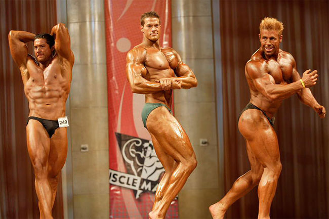 อย่าว่อกแว่กหรือโพสท่าเลียนแบบผู้เข้าแข่งขันคนอื่น อย่าหลงกลผู้เข้าแข่งขันที่ยืนใกล้ๆคุณ เขาจะพยายามยั่วคุณให้โพสท่าเลียนแบบเขา ซึ่งถ้าคุณทำตามเขา คุณอาจจะตกหลุมพราง ในร่างกายของแต่ละคน ต่างก็มี "จุดแข็ง" และ "จุดอ่อน" / หลักการ Posedown คือคุณจะต้องพยายามโชว์จุดแข็ง และปิดจุดอ่อน ต่อหน้ากรรมการ / ยกตัวอย่างเช่น คุณมีกล้ามอกด้านข้างที่สวย ถือได้ว่ากล้ามหน้าอกเป็นจุดแข็ง แต่กล้ามท้องของคุณอาจจะเป็นจุดอ่อน ในทางกลับกัน ผู้เข้าแข่งขันที่ยืนข้างๆคุณ เขามีจุดแข็งอยู่ที่หน้าท้อง คือหน้าท้องเขาสวยกว่าคุณ / เมื่ออยู่ในช่วง Posedown เขาก็จะมายืนข้างๆคุณแล้วทำท่ายั่วยุให้คุณโพสท่าเลียนแบบเขา เพื่อจะได้ประชันกันกับเขา / จากนั้น ผู้เข้าแข่งขันคนนั้นก็โพสกล้ามท้อง / ซึ่งถ้าคุณไปตกหลุมพรางนี้ และโพสท่าโชว์กล้ามท้องเหมือนเขา มันก็จะเกิดการเผยจุดอ่อนของคุณออกมา ( ซึ่งกรรมการจะเห็นการเปรียบเทียบกล้ามท้องระหว่างคุณกับผู้เข้าแข่งขันที่ยืนข้างๆ ) / นั่นจะทำให้คุณเสียคะแนน ดังนั้น เพื่อป้องกันปัญหาพวกนี้เอาไว้ล่วงหน้า ในช่วงเตรียมตัวประกวดเป็นเดือนๆนั้น คุณควรฝึกการโพสแบบเลื่อนไหล โดยเลือกท่าที่เผย "จุดแข็ง" และปิด "จุดอ่อน" ของคุณ / ให้ฝึกบ่อยๆจนอยู่ในจิตใต้สำนึก จากนั้น เมื่อคุณผ่านด่านการประกวดไปจนถึงด่าน Posedown แล้ว ก็ให้คุณโพสท่าแบบเลื่อนไหล ( อันออกมาจากจิตใต้สำนึก ) โดยอย่าว่อกแว่ก ไม่ต้องสนใจผู้เข้าแข่งขันอีก 4 คนว่าเขากำลังโพสท่าอะไรอยู่ / และแน่นอนว่าผู้เข้าแข่งขันอีก 4 คนเขาจะต้องพยายามทำให้คุณว่อกแว่ก หรือยั่วให้คุณโพสท่าเลียนแบบเขา / ดังนั้น ถ้าคุณรู้เคล็ดลับนี้แล้ว ( เคล็ดลับที่ว่าให้ฝึกโพสจนอยู่ในจิตใต้สำนึก และอย่าว่อกแว่กตอนที่อยู่ในช่วง Posedown ) คุณจะประสบความสำเร็จในช่วง Posedown 2.สร้างปฏิกิริยาตอบสนองอย่างชาญฉลาด ยังมีวิธีเอาชนะผู้เข้าแข่งขันอีก 4 คนได้ด้วยอีกวิธีหนึ่ง ซึ่งจะต่างจากวิธีแรกโดยสิ้นเชิง / คือในวิธีแรกนั้น เราจะไม่มีปฏิกิริยาตอบสนองต่อผู้เข้าแข่งขันที่เข้ามายั่วเราเลย เราจะโพสท่าของเราไปเรื่อยๆ แต่ในวิธีที่สองนี้เราจะมีปฏิกิริยาตอบสนองกับผู้ที่เข้ามายั่วเรา เพียงแต่เราต้องมั่นใจแล้วว่าเราไม่มีจุดอ่อนใดๆในร่างกายเราเลย ดังนั้น เราก็ถือโอกาสที่ผู้เข้าแข่งขันคนอื่นที่เข้ามายั่วเรานั้น ให้เราทำการ "ประชันกล้าม" กับเขาไปเลย / ลองดูในภาพข้างล่างนี้นะครับ |