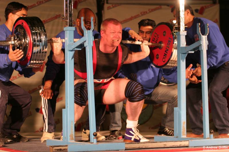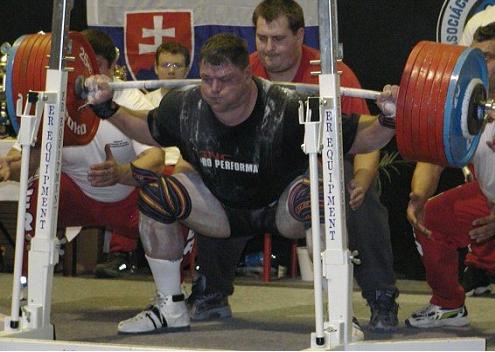 สิ่งที่ผิดกติกา คือการทำบาร์หล่น (หลังจากการยกออกจากแร็กแล้ว) ,การที่ผู้ช่วย (ที่ยืนอยู่ด้านหลังตามภาพบน) ไปแตะส่วนใดส่วนหนึ่งของบาร์เข้า ,ผู้เข้าแข่งขันย่อตัวลงไปไม่ถึงระดับที่กำหนดไว้ ,หรือการกระทำอย่างไรก็ตามในการวางบาร์กลับไปที่แร็กเหมือนเดิมโดยไม่ได้ใช้พละกำลังของตัวเอง สถิติในท่า Squat ที่ทำไว้สูงสุดตอนนี้คือ 551.3 กิโลกรัม (1213 ปอนด์) ทำไว้โดย Andrew Bolton ชาวอังกฤษ ท่าที่ 2 Benchpresses |