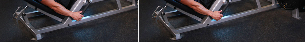 ข้างบนนี้ ) ซึ่งผลของการงอหัวเข่าได้มากกว่านั้น ( หมายถึง ในเวลาที่กำลังบริหารด้วยท่า One-Leg Leg Press ) ได้ทำให้ระยะทางการเคลื่อนที่ระหว่าง "ขาในขณะที่งอ" กับ "ขาในขณะที่เหยียด" ( หมายถึงท่า One-Leg Leg Press ) มีความกว้าง ( wider ) มากกว่าท่าที่งอหัวเข่าได้น้อย ( หมายถึงท่า Leg Press ) |