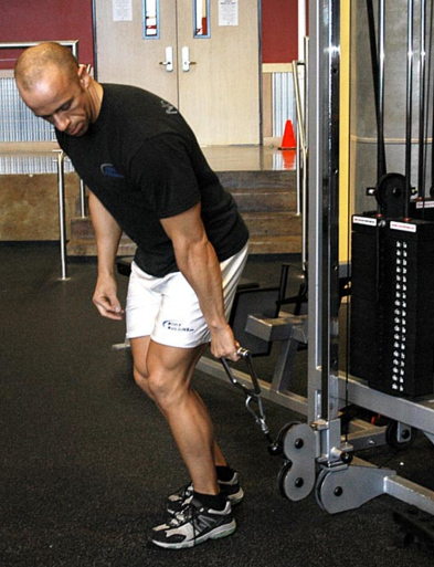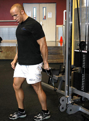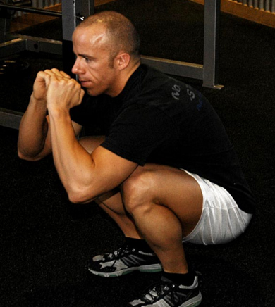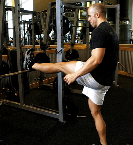 | Sissy Squats : ( ภาพบน ) อย่าทำให้ชื่อของท่านี้ทำให้คุณเข้าใจผิดคิดว่ามันจะทำได้ง่ายๆ ไม่เจ็บปวด ( Sissy เป็นศัพท์สุภาพของอังกฤษ แปลว่ากระเทยน่ะครับ ) / เพราะว่าท่ายืดท่านี้ สามารถสร้างความเจ็บปวดราวกับขาจะระเบิดได้เลยหากคุณทำมันถูกเวลา ที่ว่าทำให้ถูกเวลา ในที่นี้ก็หมายถึงว่าให้คุณยืดกล้ามเนื้อด้วยท่านี้ หลังจากที่คุณบริหารกล้ามต้นขาด้วยท่า Barbell Squats ,Leg Presses ,Lunges เสร็จเรียบร้อยแล้ว เริ่มต้นใช้เทคนิคนี้ด้วยการยืนตัวตรง จัดท่าทางให้เหมือนภาพ จังหวะที่ 1 ในภาพข้างบนนี้ ค่อยๆหย่อนก้นลงไปอย่างช้าๆ โดยระหว่างที่หย่อนก้นลงไปนั้น ให้กระดูกเชิงกราน และหัวเข่า ชี้ออกไปทางด้านหน้า ( ไม่ใช่ด้านข้าง ) จนเมื่อถึงจุดต่ำสุดแล้ว ซึ่งก็คือการที่ก้นของคุณเกือบจะแตะกับส้นเท้า ( ดังที่เห็นในภาพ จังหวะที่ 2 ในภาพข้างบนนี้ ) / ก็ให้ค้างจังหวะอยู่ใน จังหวะที่ 2 นี้ อย่างน้อย "5 วินาที" จากนั้นจึงค่อยยืนเหยียดขาขึ้น คือกลับไปสู่ จังหวะที่ 1 ใหม่ ให้ทำซ้ำเช่นนี้อีกจนกระทั่งครบ 10 reps |