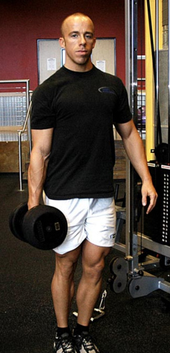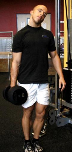 | Dumbell Trap Stretch: ( ภาพบน ) จับดัมเบลล์ไว้ด้วยมือ 1 ข้าง ( สมมติว่าเป็นมือขวา ) ปล่อยแขนข้างที่ถือดัมเบลล์นั้นให้เหยียดลงไปจนรู้สึกว่ามีความตึงเกิดขึ้นที่บริเวณด้านข้างของ หนอกคอ ข้างขวา ถือดัมเบลล์อยู่อย่างนั้น ( เหมือนในรูป จังหวะที่ 1 ในภาพข้างบนนี้ ) ค้างไว้ประมาณ 30 - 60 วินาที แล้วจึงวางดัมเบลล์ลงกับพื้น คุณอาจเพิ่มความยากด้วยการเอียงคอไปด้านตรงข้ามกับแขนข้างที่ถือดัมเบลล์อยู่ก็ได้ ( เหมือนที่เห็นในรูป จังหวะที่ 2 ในภาพข้างบนนี้ ) หลังจากนั้น จึงเปลี่ยนมาจับดัมเบลล์ด้วยมือซ้าย แล้วทำแบบเดียวกัน |