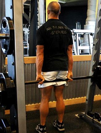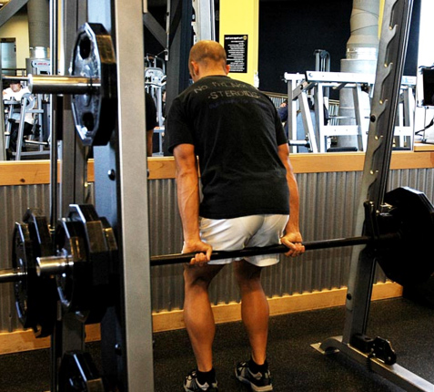 | Behind The Back Shrug Stretch: ( ภาพบน ) เพิ่มแผ่นบาร์เบลล์เข้าไปที่ตัวบาร์เบลล์เพื่อให้มันหนักขึ้น จากนั้นก็หันหลังให้บาร์เบลล์แล้วย่อตัวลงจับคานบาร์ เหมือนที่เห็นในรูป จังหวะที่ 1 ในภาพข้างบนนี้ จากนั้นก็ยืดตัวขึ้น แล้วปล่อยให้ น้ำหนักของบาร์เบลล์ "ดึง" แขนทั้งสองข้างลงโดยอิสระ ( คือ ไม่ต้องเกร็งกล้ามหนอกคอต้านเอาไว้ ) เหมือนที่เห็นในรูป จังหวะที่ 2 ในภาพข้างบนนี้ ค้างอยู่ใน จังหวะที่ 2 นี้ประมาณ 30 - 60 วินาที ( Webmaster - การใช้เทคนิค E.F.S. หลังการฝึกกล้ามบ่าและหัวไหล่ มีบอกไว้แค่นี้ สิ่งที่ต้นฉบับไม่ได้พูดก็คือว่าให้ทำทั้ง 3 ท่านี้เลยหรือเปล่า หรือแค่เลือกเอามา 1 ท่า ( จากใน 3 ท่าข้างบนนี้ ) / แต่ในความเห็นของผม คิดว่าคงจะให้ทำทั้งสามท่านั่นแหละครับ เพราะแต่ละท่าก็ใช้เวลาแค่ 30 - 60 วินาทีเท่านั้น / ถ้าทำสามท่าก็คงไม่หนักหนาอะไร / ก็เลยคิดว่าเจตนาของต้นฉบับ ก็คือให้ทำทั้งสามท่า / ไม่อย่างนั้น เขาต้องเน้นมาว่าให้เลือกเอามาทำแค่ 1 ท่าเท่านั้น แต่เขาไม่ได้บอก ) |
