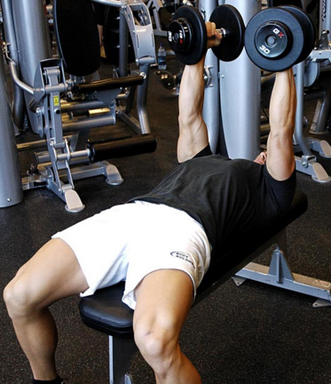 | Dumbell Fly Stretch: ( ภาพบน ) หลังจากบริหารกล้ามหน้าอกครบทุกท่าแล้ว ให้คุณใช้เทคนิค E.F.S. ด้วยการถือดัมเบลล์ไว้ในมือทั้งสองข้าง โดยเลือกขนาดน้ำหนักของดัมเบลล์เท่าที่ทำให้คุณบริหารด้วยท่า Dumbbell Flys "8 ครั้ง" แล้วหมดแรงพอดี หลังจากถือดัมเบลล์ไว้ในมือทั้งสองข้างแล้ว ก็นอนราบบนม้ายกน้ำหนัก โดยเลือกใช้ม้านอนแบบราบขนานกับพื้น ไม่ปรับเอียงหัวขึ้น ไม่ปรับเอียงหัวลง ให้เหยียดแขนตรงขึ้นไปบนเพดานห้อง ให้ดัมเบลล์ทั้งสองลูกอยู่ติดๆกัน เหมือนที่เห็นในรูป จังหวะที่ 1 ในภาพข้างบนนี้ จากนั้นก็ค่อยๆถ่างดัมเบลล์ออกจากกัน "อย่างช้าๆ" จนกระทั่งเรากางแขนกว้างที่สุดแล้ว คือกล้ามอกเหยียดตึงอย่างที่สุดแล้ว ไม่สามารถเหยียดไปได้มากกว่านั้นอีกแล้ว เหมือนที่เห็นในรูป จังหวะที่ 2 ในภาพข้างบนนี้ ให้ค้างอยู่ใน จังหวะที่ 2 นี้เป็นเวลา 30 - 60 วินาที และคุณต้องพยายามทนความเจ็บปวดในระหว่างที่ค้างจังหวะอยู่นี้ด้วยนะครับ ในการใช้เทคนิค E.F.S. หลังการเล่นกล้ามหน้าอกเสร็จในครั้งต่อๆไป คุณอาจลองเปลี่ยนไปนอนบนเตียงแบบปรับหัวขึ้น หรือเตียงแบบปรับหัวลง เพื่อเปลี่ยนมุมของกล้ามหน้าอกที่ถูกเหยียด |