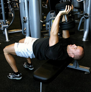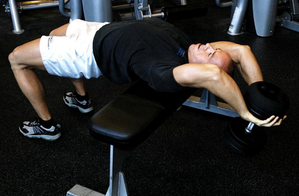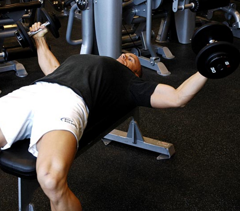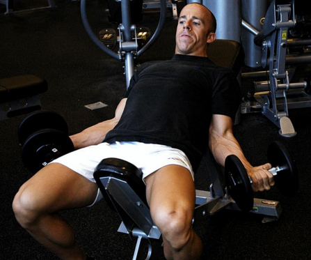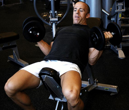 | Incline Dumbell Stretch : ( ภาพบน ) คุณจะมีไบเซบปูดโปนได้แค่เท่าที่ผังผืดคุณกำหนดไว้ / เทคนิค E.F.S. จะขยายขอบเขตผังผืดที่ไบเซบของคุณ จนทำให้กล้ามไบเซบของคุณปูดโปนขึ้นไป มากกว่าที่เคยเป็นอยู่ เริ่มต้นด้วยการถือดัมเบลล์ไว้ในมือทั้งสองข้าง แล้วนั่งเอนหลังลงไปบนม้านั่งที่ปรับหัวขึ้น ใน จังหวะที่ 1 ให้เกร็งกล้ามไบเซบด้วยการถือดัมเบลล์ให้อยู่ในระดับสูงที่สุด จากนั้นค่อยๆผ่อนดัมเบลล์ลงไปด้านล่างของแขนแต่ละข้าง แต่ "ไม่ให้" ผ่อนดัมเบลล์ลงไปจนห้อยแขนลงตรงๆ แต่ให้ผ่อนลงเท่าที่กล้ามไบเซบของเราจะรู้สึกเจ็บปวดอย่างที่สุด เหมือนที่เห็นในภาพ จังหวะที่ 2 ในภาพข้างบนนี้ ให้ค้างอยู่ใน จังหวะที่ 2 นี้ เป็นเวลา 30 - 60 วินาที |