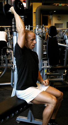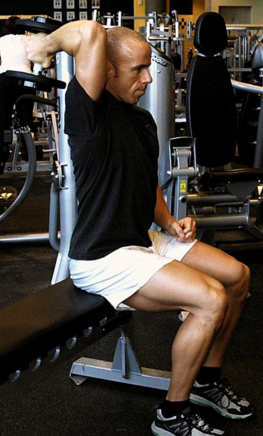 | One Arm Extension Stretch : ( ภาพบน ) ท่ายืดกล้ามอันนี้จะช่วยขยายขนาดกล้ามรูปเกือกม้าที่อยู่ด้านหลังของต้นแขนคุณ ( หมายถึงกล้ามไทรเซบนั่นเอง ) ให้คุณยืดกล้ามเนื้อนี้หลังจากบริหารท่าหลักๆเรียบร้อยแล้ว อันได้แก่การบริหารท่า Skull Crushers ,Close - Grip Bench Presses ,Press Downs ให้คุณเลือกขนาดน้ำหนักของดัมเบลล์ ที่ "หนักกว่า" ตอนที่คุณบริหารในท่า One Arm Tricep Extension ตามปกติสักเล็กน้อย นั่งลงบนเตียงที่ขนานกับพื้น แล้วชูแขนข้างขวาที่ถือดัมเบลล์อยู่ เหยียดตรงขึ้นไปตรงๆ เหมือนที่เห็นในภาพ จังหวะที่ 1 ในภาพข้างบนนี้ ใช้เวลา " 5 วินาที " ในการค่อยๆผ่อนดัมเบลล์ให้ต่ำลงมาตั้งแต่ภาพใน จังหวะที่ 1 จนถึงภาพใน จังหวะที่ 2 / โดยใน จังหวะที่ 2 คือการที่คุณลดดัมเบลล์ลงมาต่ำที่สุดเท่าที่จะทำได้แล้ว ซึ่งจะทำให้กล้ามไทรเซบข้างขวาของคุณตัองเจ็บปวดเป็นอย่างมาก ค้างอยู่ใน จังหวะที่ 2 นี้ เป็นเวลา 30 - 60 วินาที แล้วจึงเปลี่ยนข้าง ไปยืดที่แขนข้างซ้าย |
