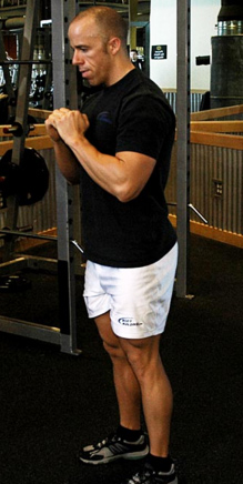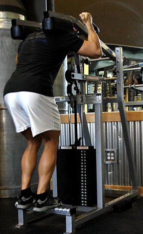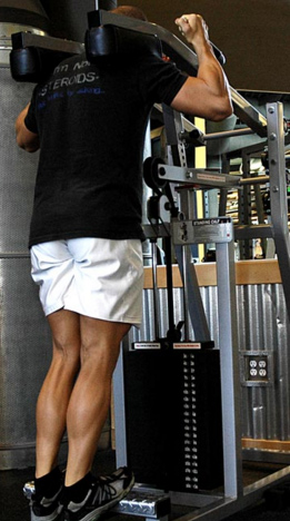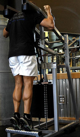 | Standing Calf Raise Stretch : กล้ามน่องแบบหนาเทอะทะและมี รูปทรงเป็นเพชร แบบที่ใครๆก็อยากได้ จะตกเป็นของคุณได้ก็ด้วยการยืดเส้นในท่านี้ เริ่มต้นด้วยการขึ้นไปยืนบน Standing Calf Raise Machine / ให้ใช้แผ่นน้ำหนักในขนาดที่คุณบริหารท่านี้ตามปกติ ได้ 8 reps แล้วหมดแรงพอดี จากนั้น ให้เกร็งกล้ามน่อง แล้วเขย่งร่างกายขึ้นจนสุดตัว อย่างที่เห็นในภาพ จังหวะที่ 2 ในภาพข้างบนนี้ จากนั้นก็ค่อยๆผ่อนกล้ามน่อง ด้วยการเคลื่อนที่ร่างกายทั้งหมดลงอย่างช้าๆ จนกระทั่งระดับของส้นเท้าอยู่ต่ำกว่าแผ่นยืน และอยู่ต่ำกว่าระดับนิ้วเท้าของเราเอง และไม่สามารถลงไปต่ำได้มากกว่านี้อีกแล้ว ซึ่งก็คือภาพ จังหวะที่ 3 ที่เห็นอยู่ในภาพข้างบนนี้ ค้างอยู่ใน จังหวะที่ 3 นี้ 30 - 60 วินาที สำหรับการยืดเส้นในท่านี้ คุณสามารถปรับเปลี่ยนรูปแบบของการวางเท้าได้ตามใจชอบ |