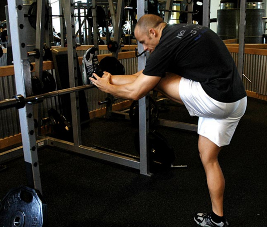 | Incline Hurdler's Stretch : ( ภาพบน ) ในท่านี้ดูเผินๆแล้วเหมือนกับท่ายืดเส้นตั้งแต่สมัยรุ่นคุณปู่ คุณย่า ที่เขาทำกันตอนก่อนออกวิ่งจ๊อกกิ้ง / แต่ความจริงแล้ว มันไม่ใช่แบบเดียวกันนะครับ สำหรับท่านี้ ให้เริ่มต้นด้วยการยืนบนขาข้างเดียวก่อน ( เช่นยืนบนขาขวาข้างเดียว ) แล้วเอาขาซ้าย ตรงบริเวณตะตุ่มไปพาดไว้บนคานอะไรสักอย่าง โดยคานนั้น ให้วางอยู่ในระดับสูงเดียวกันกับระดับสะโพก / พยายามให้ขาข้างซ้ายนี้ เหยียดตรงที่สุดเท่าที่จะทำได้ ทั้งหมดที่ว่ามานี้ ก็คือการจัดท่าทางให้เหมือนกับภาพใน จังหวะที่ 1 ที่เห็นในภาพข้างบนนี้ จากนั้น ให้เพิ่มความขมึงเกลียวไปที่กล้ามต้นขาด้านหลัง ( Hamstrings ) ของขาด้านซ้ายของคุณ ด้วยการกดสะโพกของคุณลง พร้อมๆกับการพยายามเอาใบหน้าของคุณให้เข้าไปใกล้หัวเข่าให้มากที่สุด หลังจากทำเสร็จแล้ว จึงสลับเอาขาขวามาพาดแทนขาซ้าย แล้วทำเหมือนกันกับที่ทำกับขาข้างซ้าย |