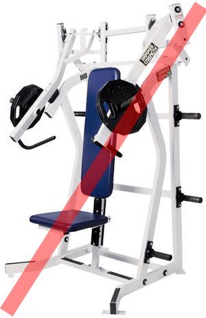 เบาะน้ำเงิน ) ซึ่งอุปกรณ์ด้านล่างนี้ มีไว้เล่นท่า Hammer strength bench presses คือเป็นท่า bench presses ธรรมดา ไม่ได้เป็นการ "incline ( เอียง )" เหมือนอุปกรณ์ในรูปข้างบนนี้นะครับ |