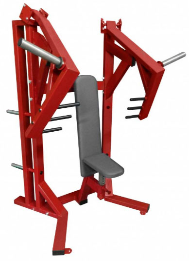 | คำว่าเครื่องแมชชีนเพรส ในความหมายของผมคือจะต้องดันอุปกรณ์ไปข้างหน้า "ตรงๆ" ได้ ซึ่งส่วนมาก อุปกรณ์แมชชีนเพรสแบบอเนกประสงค์ ที่มีราคาแพงหน่อย เขาจะออกแบบที่จับเหมือนในภาพข้างบน เพื่อจะได้เล่น 2 แบบคือ ดันไปข้างหน้าตรงๆ (เพื่อเล่นอกส่วนกลาง) และ ดันเฉียงขึ้นไปข้างบน (เพื่อเล่นอกส่วนบน เหมือนกับอุปกรณ์ อินไคลน์แมชชีนเพรส (คลิ๊กเพื่อดู)) ได้ในเครื่องเดียวกัน |