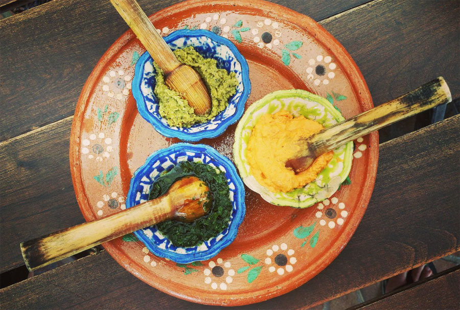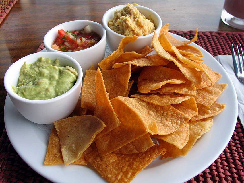 ( ภาพบน ) ซัลซ่า มีหลายชนิด ที่เห็นในภาพนี้เมื่อดูแบบตามเข็มนาฬิกา มีชื่อเรียงลำดับดังนี้ ฮามาเนโร ( สีเขียวอ่อน ) , ชิโปตเล ( สีเหลือง ) และ ซิมิซูริริ ( สีเขียวเข้ม ) |