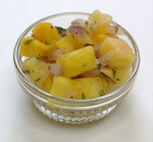 ( ภาพบน ) ซัลซามะม่วงและสับปะรด ใส่พริกคาลาเปโญ หอมแดง และผักชี |