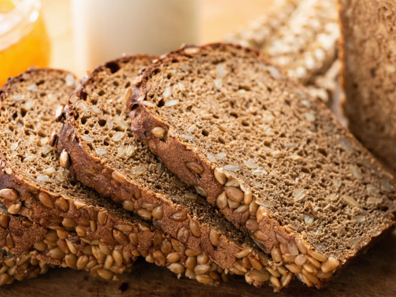 ( ภาพบน ) ขนมปังธัญพืชจะคล้ายกับขนมปังโฮลวีต แต่จะใส่ธัญพืชทั้งเมล็ดเข้าไปด้วย ทำให้เนื้อขนมปังมีเนื้อสัมผัสมากขึ้น การที่ขนมปังทำมาจากธัญพืชเต็มเมล็ด ไม่ผ่านการขัดสีหรือขัดสีน้อย ทำให้ทุก ๆ ส่วนของเมล็ดยังอยู่ครบ ตั้งแต่เยื่อหุ้มเมล็ด จมูกข้าว และเนื้อเมล็ด มีสารอาหารที่ครบถ้วน มีประโยชน์ต่อร่างกาย ขนมปังโฮลเกรนที่สายไดเอทเค้ารักการทานขนมปังมีอยู่ 5 ชนิด 1.ขนมปังโฮลวีต ( Whole Wheat ) ขนมปังโฮลวีท ( Whole Wheat Bread ) คือ ขนมปังที่ทำมาจากเมล็ดข้าวสาลีทั้งเมล็ด ส่วนขนมปังธัญพืช ( Whole Grain Bread ) หมายถึง ขนมปังที่ทำมาจากเมล็ดพืชต่าง ๆ เช่น ข้าวโอ๊ต ข้าวบาร์เลย์ ข้าวสาลี หรือธัญพืชไม่ขัดสีชนิดต่าง ๆ รวมกัน ต่างจากขนมปังวีท ( Wheat Bread ) หรือมัลติเกรน ( Multi Grain ) ซึ่งอาจทำมาจากธัญพืชที่ผ่านการขัดสีบางส่วน ขนมปังโฮลวีทจึงอุดมไปด้วยไฟเบอร์และสารอาหารต่าง ๆ เช่น วิตามินอี วิตามินบี หรือสารต้านอนุมูลอิสระ ต่างจากขนมปังขาวที่ผ่านกระบวนการแปรรูป ทำให้ได้รับสารอาหารต่าง ๆ น้อยกว่า ทำให้ผู้คนเชื่อว่า ร่างกายจะได้รับประโยชน์จากขนมปังโฮลวีทมากกว่าขนมปังขาว ประโยชน์ของขนมปังโฮลวีทมีอะไรบ้าง? ค่าดัชนีน้ำตาล ( Glycaemic Index: GI ) ของขนมปังโฮลวีทต่ำกว่าขนมปังขาว โดยดัชนีน้ำตาล ( Glycaemic Index: GI ) คือ ค่าแสดงระดับน้ำตาลในเลือดหลังรับประทานอาหารแต่ละอย่าง เนื่องจากอาหารแต่ละอย่างมีคาร์โบไฮเดรตต่างชนิดกัน ส่งผลให้ร่างกายย่อยอาหารเหล่านั้นและเพิ่มระดับน้ำตาลในเลือดต่างกัน ขนมปังโฮลวีทมีดัชนีน้ำตาลปานกลาง ( ประมาณ 56- 69 ) ส่วนขนมปังขาวมีดัชนีน้ำตาลสูง ( ประมาณ 70 หรือมากกว่านั้น ) มีปัจจัยหลายอย่างที่ส่งผลต่อระดับดัชนีน้ำตาลในอาหาร ซึ่งไขมันและไฟเบอร์เป็นปัจจัยหนึ่งที่ช่วยลดค่าดัชนีน้ำตาลของอาหารได้ อีกทั้งยังส่งผลดีต่อผู้ป่วยโรคเบาหวานชนิดที่ 2 ( Type 2 Diabetes Mellitus; T2DM ) เนื่องจากช่วยควบคุมระดับน้ำตาลในเลือดหลังมื้ออาหาร ขนมปังโฮลวีทมีผลดีต่อระบบเผาพลาญพลังงาน ( Metabolism ) และฮอร์โมนความอยากอาหาร โดยการบริโภคขนมปังธัญพืชไม่ขัดสีจัดเป็นการรับประทานคาร์โบไฮเดรตเชิงซ้อน ( Complex Carbohydrates ) ที่ดีกว่าคาร์โบไฮเดรตเชิงเดี่ยว โดยคาร์โบไฮเดรตเชิงซ้อนจากไฟเบอร์ที่สูงจะช่วยทำให้รู้สึกอิ่มนาน ย่อยช้าลง และอาจช่วยลดความอยากอาหารที่ส่งผลดีต่อสุขภาพ จากการศึกษาวิจัยเปรียบเทียบประโยชน์ของขนมปังทั้งสองชนิดที่อาจส่งผลต่อน้ำย่อยในกระเพาะอาหาร พลังงานที่ได้รับ และฮอร์โมนที่ส่งผลต่อความอยากอาหาร โดยได้ทดลองกับผู้ที่รับประทานขนมปังแปรรูปและขนมปังธัญพืชไม่ขัดสีในช่วงมื้อเช้าของทุกวัน