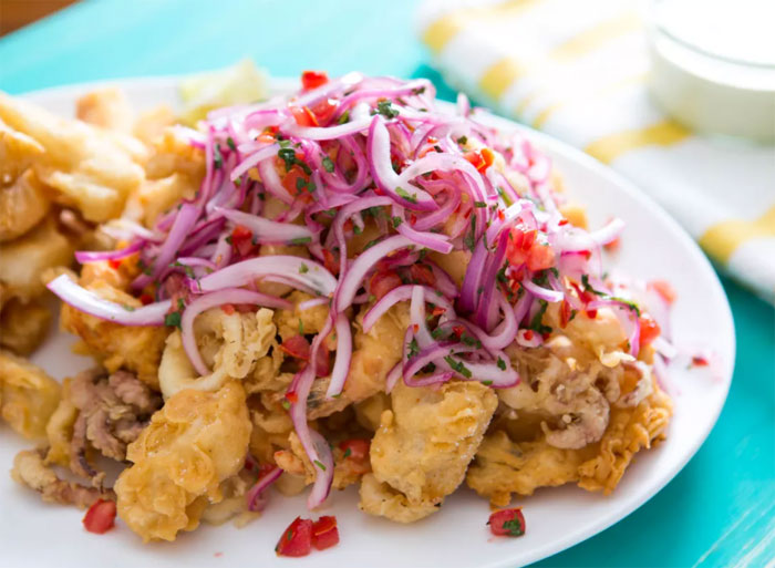 ( ภาพบน ) ชื่ออาหาร : Peruvian Fried Seafood Platter With Lime-Marinated Onion and Tomato Salad ( Jalea ) |