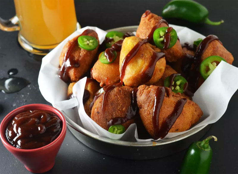 ( ภาพบน ) ชื่ออาหาร : Cornbread-Coated Pulled Pork Mac and Cheese Wedges |