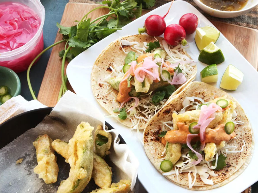 ( ภาพบน ) :ชื่ออาหาร : Fried-Avocado Tacos With Chipotle Cream , Cabbage , and Pickled Red Onions |