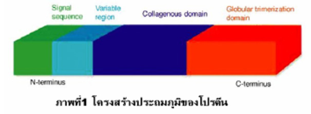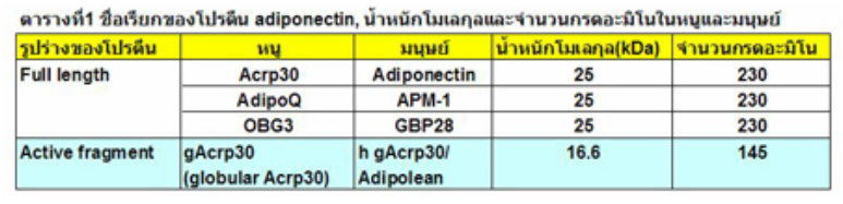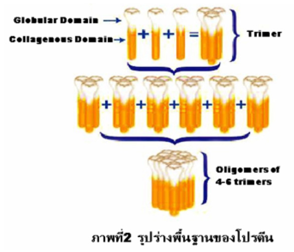 โครงสร้างของโปรตีน adiponectin Adiponectin เป็นโปรตีนที่ประกอบด้วยกรดอะมิโน 230 ตัว มีขนาดประมาณ 25-30 kDa สร้างออกมาจากเซลล์ไขมันโดยเฉพาะ เนื่องจากโปรตีน ชนิดนี้ได้ถูกค้นพบโดยนักวิทยาศาสตร์หลายกลุ่มในช่วงเวลาใกล้เคียงกันจึงมีชื่อเรียกแตกต่างกันออกไปดังแสดงในตารางที่ 1 ได้แก่ Acrp30 ( adipocyte complement-related protein of 30 kDa ), adipose most abundant gene transcript-1 ( APM1 ), GBP-28 ( gelatin-binding protein of 28 kDa ) , AdipoQ และ adiponectin ( 2-5 ). โครงสร้างปฐมภูมิของโปรตีนชนิดนี้ประกอบด้วย 4 ส่วนหลักคือ signal sequence อยู่ทางด้าน N-terminal , variable region , collagenous domain และ globular domain ที่อยู่ทางด้าน C-terminal ตามลำดับ ( ภาพที่ 1 ) ลักษณะรูปร่างพื้นฐานโดยรวมของ adiponectin จะอยู่รวมกันเป็น trimer โดยใช้ส่วน globular domain จับกัน ซึ่งประมาณ 4-6 trimers ประกอบรวมกันเป็น oligomers ทำให้เกิดโครงสร้างที่มีขนาดใหญ่มากขึ้น ดังแสดงในภาพที่ 2.5 |
