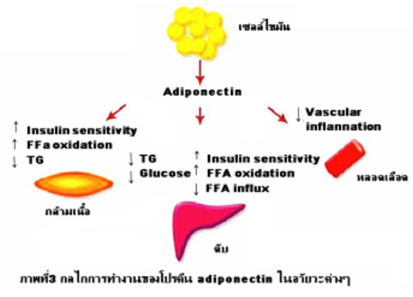โปรตีน adiponectin มีผลต่ออวัยวะต่างๆ ในร่างกายดังแสดงในภาพที่ 3 โดยกลไกการทำงานของโปรตีน adiponectin ต่อกรดไขมันอิสระ ( free fatty acid ) ในเซลล์กล้ามเนื้อลายและเซลล์ตับพบว่ามีผลเพิ่มการแสดงออกของยีนหลายชนิดที่เกี่ยวข้องกับ fatty acid transporter และ fatty acid oxidation ในเซลล์กล้ามเนื้อลาย ได้แก่ CD 36 ( fatty-acid transporter protein ) , ACO ( acyl-CoA oxidase ) และ UCP2 ( uncoupling protein 2 ). ดังนั้น จึงมี ผลเพิ่มการเผาผลาญไขมันและเพิ่มการใช้พลังงานในกล้ามเนื้อมากขึ้น และยังมีผลลดปริมาณ triglyceride อีกด้วย. ส่วนในเซลล์ตับนั้น โปรตีน adiponectin มีผลลดการแสดงออกของยีน CD 36 ทำให้ลดการนำเข้าของ free fatty acid กลับสู่เซลล์ตับ และมีผลลดปริมาณ triglyceride การทำงานของโปรตีน adiponectin ต่อการเพิ่มความไวของอินซูลินในร่างกาย ได้มีรายงานการศึกษาโดย Yamauchi และคณะ ในปี พ.ศ. 25449 ซึ่งพบว่าโปรตีนชนิดนี้มีผลเพิ่มการนำส่งสัญญาณของอินซูลินในเซลล์กล้ามเนื้อลาย โดยเพิ่มการเหนี่ยวนำ tyrosine phosphorylation ของ insulin receptor. นอกจากนั้นได้มีรายงานการศึกษาเพิ่มเติมเกี่ยวกับกลไกการกระตุ้นผ่าน 5'-AMP kinase ในเซลล์กล้ามเนื้อลายและเซลล์ตับ ซึ่งทำให้เพิ่มการใช้พลังงานของเซลล์เหล่านี้และเพิ่มกระบวนการเมตาบอลิซึมของกลูโคสและไขมัน ปัจจุบันได้มีรายงานการค้นพบตัวรับ ( receptor ) สำหรับโปรตีน adiponectin จำนวน 2 ชนิดซึ่งมีการกระจายตัวที่แตกต่างกันออกไป ตามอวัยวะที่เกี่ยวข้องกับกระบวนการทำงานของกลูโคสและไขมัน ได้แก่ AdipoR1 และ AdipoR2 โดย AdipoR1 พบได้มากในกล้ามเนื้อลาย ส่วน AdipoR2 พบเป็นส่วนมากในตับ.11 เมื่อเร็วๆ นี้ได้มีรายงานแสดงความสัมพันธ์ระหว่างความแปรปรวนของลำดับเบสของดีเอ็นเอ ( polymorphism ) บนตัวรับของ โปรตีน adiponectin ( adiponectin receptor ) กับการเกิดโรคเบาหวานชนิดที่ 2 อย่างชัดเจนเนื่องจากความผิดปกติของตัวรับชนิดนี้มีผลลดการนำส่งสัญญาณของอินซูลินและลดความไวต่ออินซูลินในร่างกาย บทสรุป Adiponectin เป็น adipocytokines ชนิดหนึ่งที่ถูกสร้างขึ้นเฉพาะจากเซลล์ไขมัน โดยมีกล้ามเนื้อลายและตับเป็นอวัยวะเป้าหมายหลักในการออกฤทธิ์ ซึ่งมีผลต่อกระบวนการเมตาบอลิซึมของกลูโคสและไขมัน. ได้มีรายงานการศึกษาหลายชิ้นที่แสดงความสำคัญของ adiponectin ต่อการเพิ่มความไวของอินซูลินในร่างกาย กลไกที่สำคัญนั้นมีความเกี่ยวข้องกับ fatty acid transport และ fatty acid oxidation นอกจากนี้ยังมีผลโดยตรงต่อการเพิ่มการนำส่งสัญญาณของอินซูลินและยังเพิ่มการทำงานของ 5'-AMP kinase อีกด้วย. จากบทบาทหน้าที่ของโปรตีน adiponectin ต่อการเพิ่มความไวของอินซูลินจึงน่าจะเป็นประโยชน์ในการนำความรู้เหล่านี้มาใช้ เพื่อการสังเคราะห์โปรตีนชนิดนี้โดยอาศัยความรู้ทางด้านเทคโนโลยีชีวภาพมาประยุกต์ใช้ผลิตโปรตีน adiponectin หรือการศึกษาฤทธิ์ของสมุน