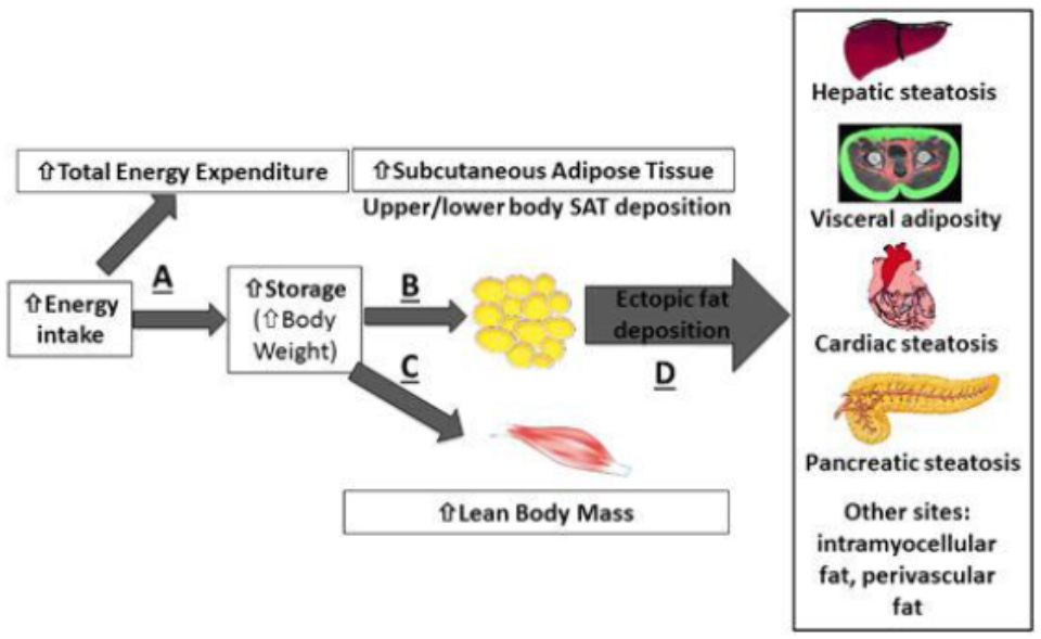 ร่างกายของเรามีกลไกในการกำจัดหรือเก็บสะสมของพลังงานจากอาหารที่เรารับประทานเกินความต้องการใน 4 รูปแบบ A. ร่างกายเราจะเอาไปใช้เป็นพลังงานเพิ่ม ถ้าเราเอาพลังงานส่วนเกินตรงนี้ไปใช้ทั้งหมดในกิจกรรมต่างๆ เช่นออกกำลัง น้ำหนักของเราก็จะไม่เพิ่ม B. ถ้าเราใช้ไม่หมดในกิจกรรม หรือออกกำลัง พลังงานส่วนเกินจุดนี้จะไปสะสมเป็นไขมัน ในเซลล์ไขมัน ( Adipose tissue ) C. หรืออาจจะนำไปใช้สร้าง Lean tissue ดังนั้นถ้าเราต้องการสร้างกล้ามเนื้อเราก็เพิ่มพลังงานจากอาหาร D. สิ่งที่แย่สุดอยู่ตรงนี้ เมื่อพลังงานส่วนเกินสะสมในรูปในเซลล์ไขมันเต็มจนรับไม่ไหวแล้ว ไขมันจะเริ่มไปสะสม ( Ectopic fat deposition ) ในรูป Visceral fat , หรือสะสมในอวัยวะต่างๆ เช่น ไขมันพอกตับ ( Hepatic steatosis ) , ไขมันสะสมในช่องท้อง ( Visceral adiposity ) , ไขมันในหัวใจ ( Cardiac steatosis ) หรือ ตับอ่อน ( Pancreatic streatosis ) ปล. Adipose tissue เรียกง่ายๆว่า body fat พบได้ทั่วไปในร่างกายในรูปไขมันใต้ผิวหนัง ( subcutaneous fat ) หรือสะสมในอวัยวะต่างๆในรูป visceral fat, ระหว่างกล้ามเนื้อ ภายในไขกระดูก หรือในเนื้อเยื่อเต้านม Ectopic fat deposition คือ ไขมันส่วนเกินที่สะสมในรูปของไตรกลีเซอไรด์ที่ใน non-adipose tissue ซึ่งมีส่วนทำให้เกิดภาวะดื้ออินซูลิน หรือ เบาหวานประเภทที่ 2 นอกจากนี้ไขมันในช่องท้อง (visceral fat) / ภายในช่องท้อง (intra-abdominal fat) ที่เพิ่มขึ้นเป็นตัวบ่งชี้ของ Ectopic fat deposition การอ้างอิง Britton, K.A., & Fox, C.S. (2011). Ectopic fat depots and cardiovascular disease. Circulation, 124(4), 837-841. https://doi/full/10.1161/circulationaha.111.077602 Lettner, A., & Roden, M. (2008). Ectopic fat and insulin resistance. Current diabetes reports, 8(3), 185–191. https://doi.org/10.1007/s11892-008-0032-z RN5504 Nutrition and Health through the Life Stages lecture, Clinical Nutrition, University of Aberdeen ขอขอบคุณข้อมูลจาก : https://www.facebook.com/JPplantbasednutrition/photos/a.316194400236512/230824552106831/?type=3 |