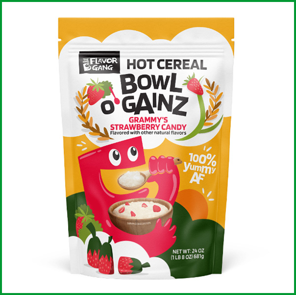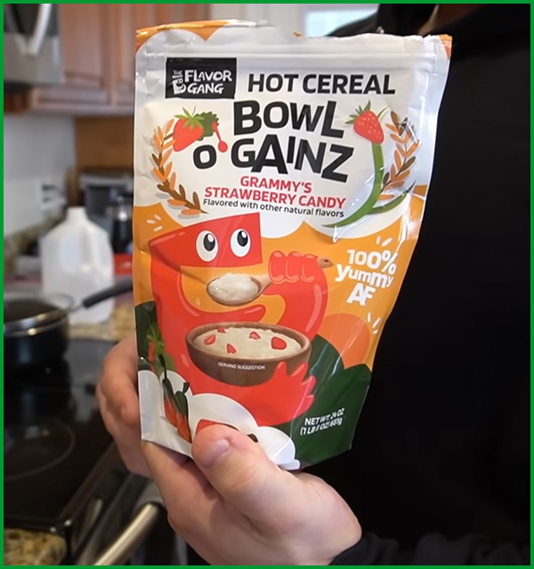 ( ดูที่เวลา 11.00 น.ของวีดีโอ ) ทานซีเรียล ยี่ห้อ Bowl O Gainz รสสตรอเบอรี่ ในปริมาณ 75 กรัม |